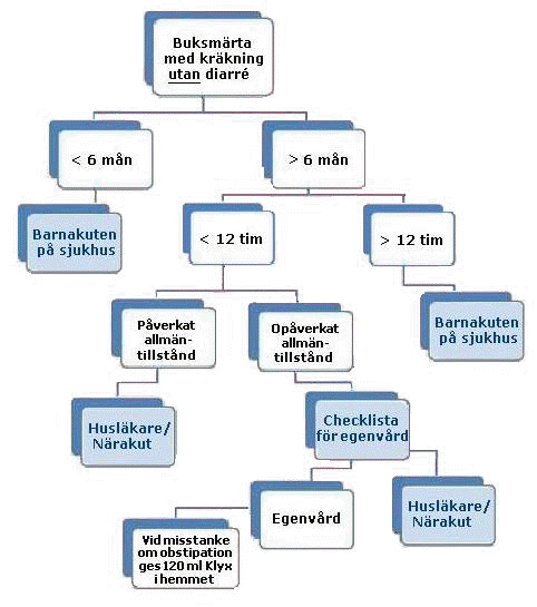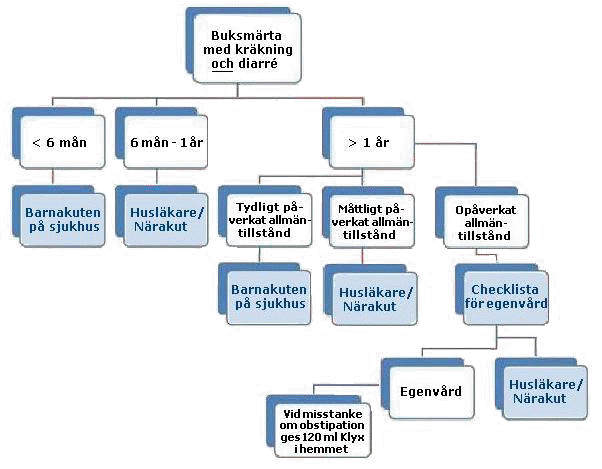 Nedan handläggningsprogram är ett beslutsstöd för läkare vid handläggning av barn med akut buksmärta. Här anges vilka barn som kan ges råd om egenvård (inkl per telefon), liksom till vilken vårdnivå man ska hänvisa barn då läkarbedömning är aktuell.