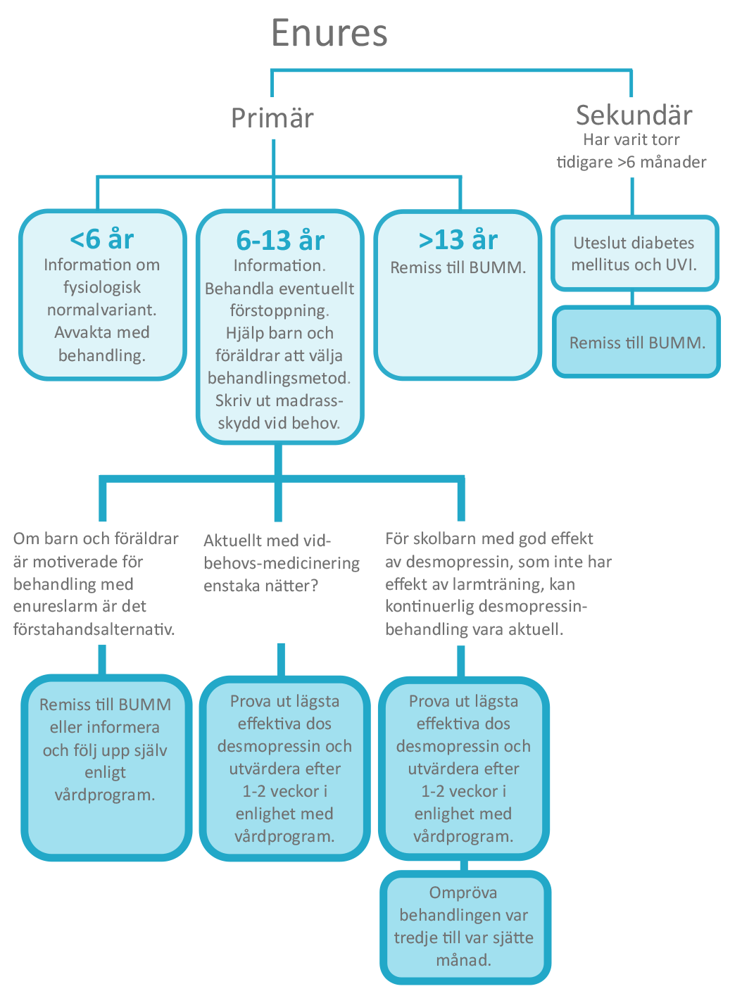 - Sekundär enures: Enures som återkommer efter tidigare torr period >6månader. Psykogena faktorer kan ligga bakom sekundär enures och dessa barn utreds på BUMM.