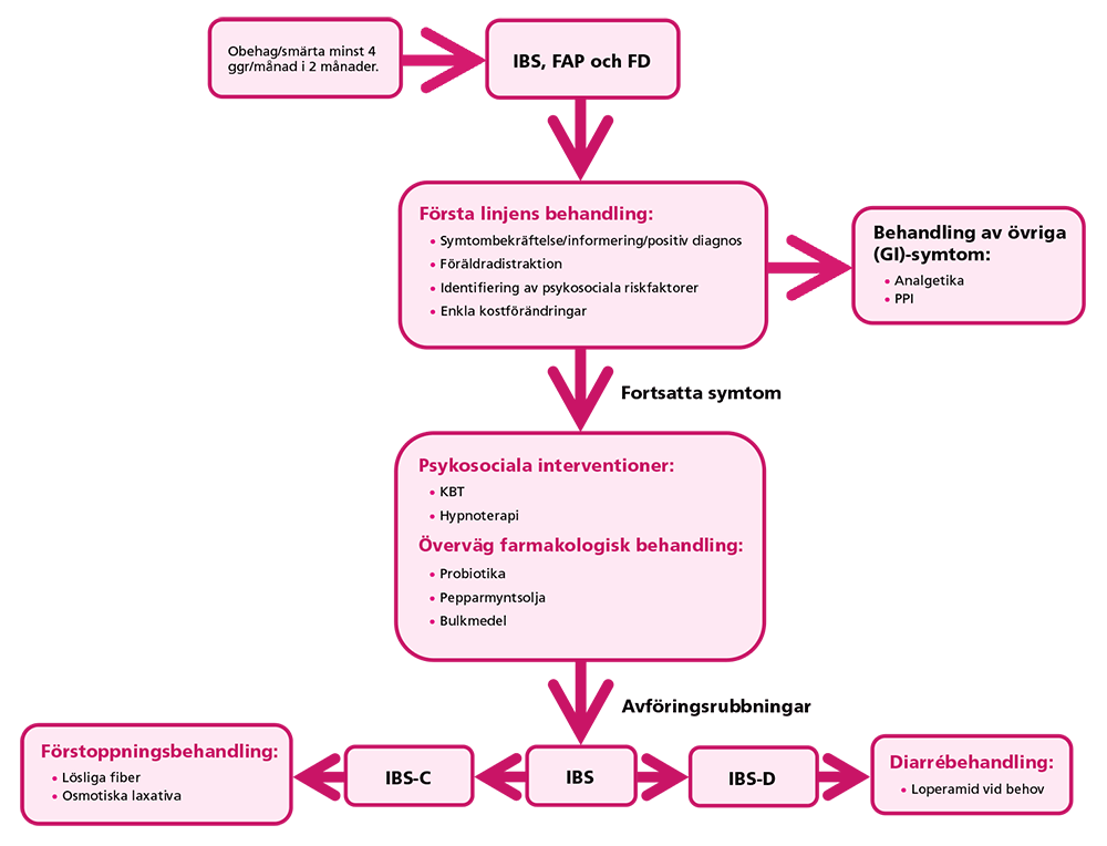 • Diagnosen är fastställd: IBS, funktionell dyspepsi eller ospecificerad funktionell buksmärta