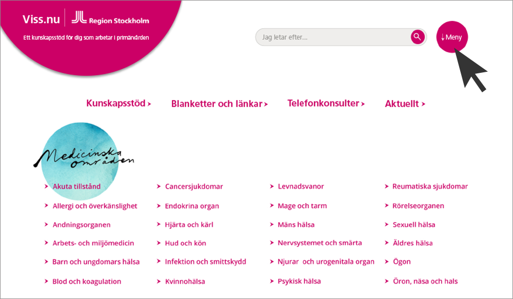 Från startsidan tar du dig till innehållet via ingången Meny som du hittar längst upp till höger, se pil. När du rör vid knappen visas en stor meny där du kan välja mellan ingångarna Medicinska områden, Kunskapsstöd, Blanketter och länkar, Telefonkonsulter och Aktuellt.