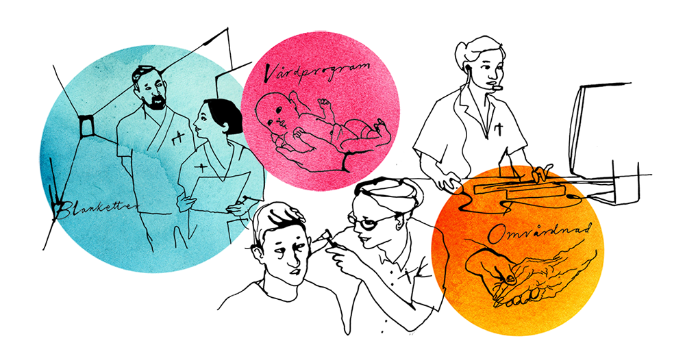 I illustrationen på startsidan finns tre direktingångar som tar dig till Blanketter, Vårdprogram och Omvårdnad, se pilarna.